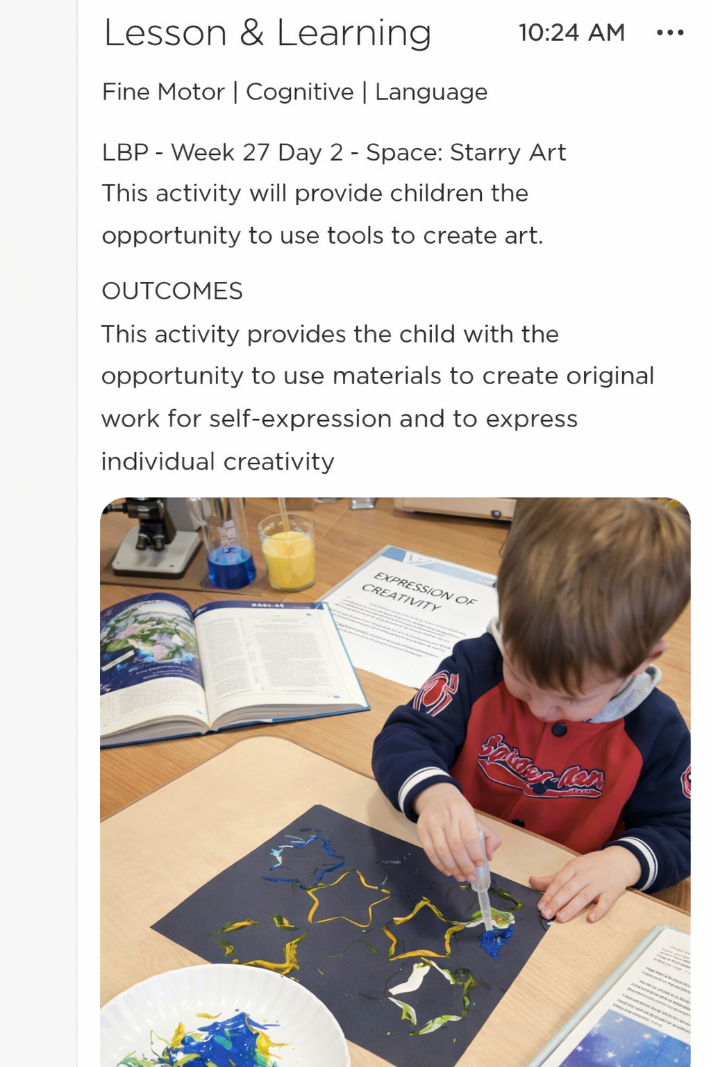 Lesson plans include clear learning objectives and outcomes, and families receive photo documentation through our parent app so they can see learning in action.
